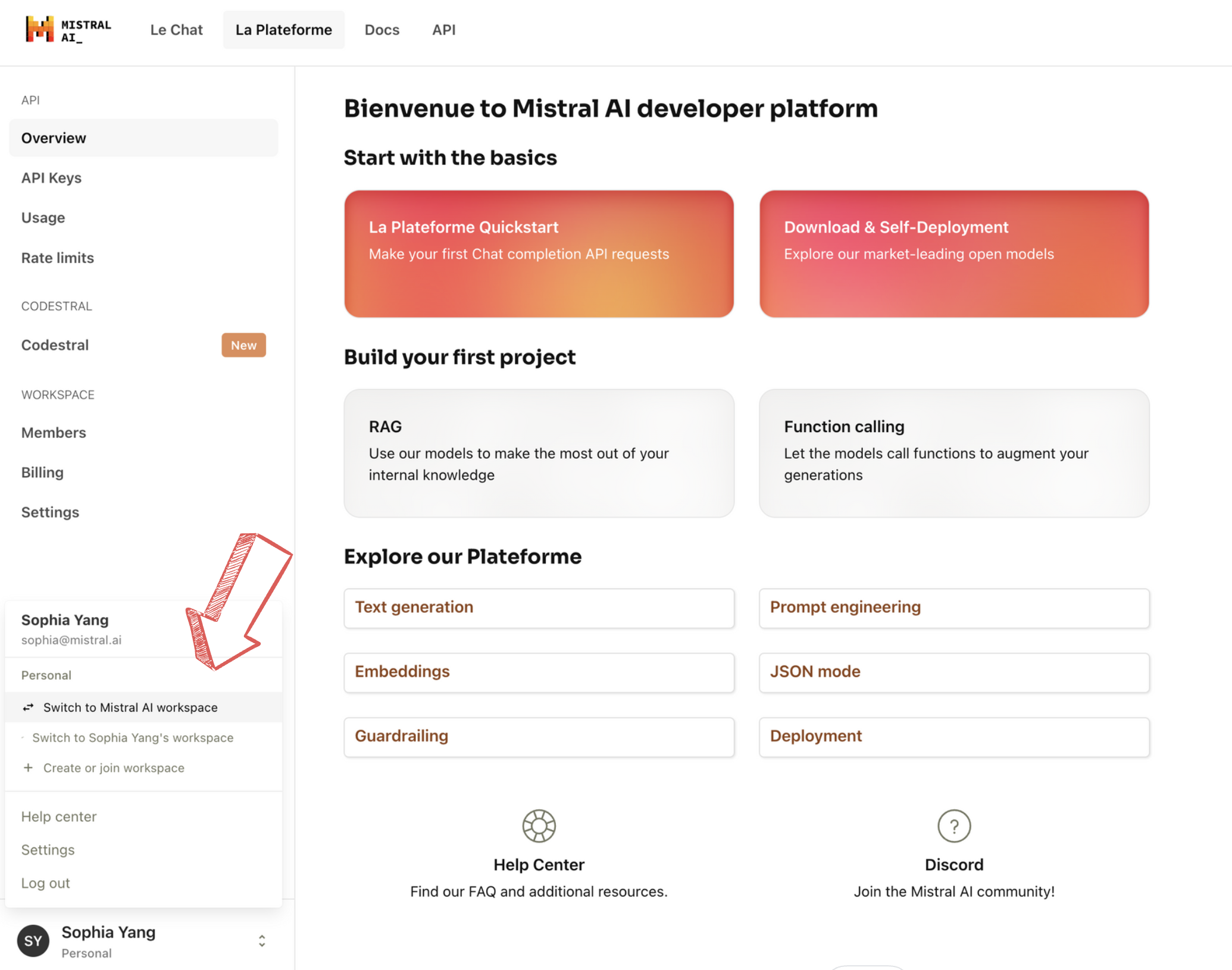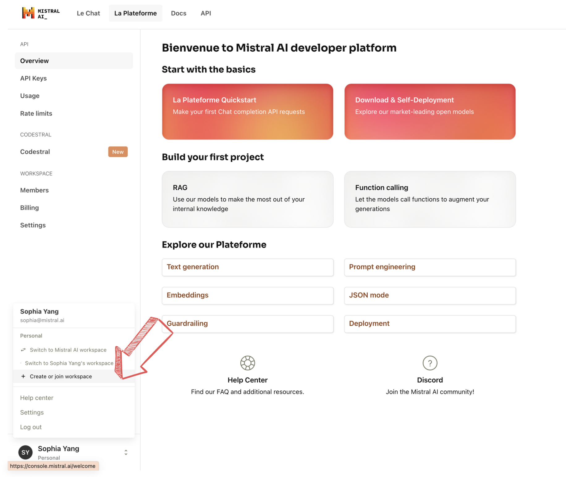 Alternatively, if you are already in La Plateforme, click on your name in the bottom left section, followed by selecting "Create or join workspace".